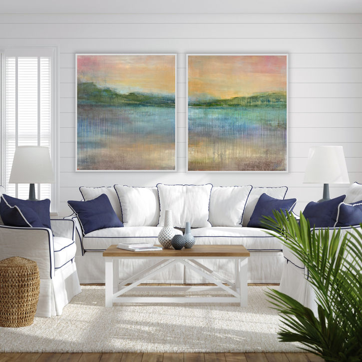 It's no secret that Maeve Harris landscapes that are inspired by light and nature, but the design aesthetic and color study in her paintings updates the traditional genre into modern appeal. Her work incorporating experimental mixed medium like gold leaf and instant coffee, create dynamic layers of visual interest to capture settings of the sea, mountains, desert, and abstract vistas that feel postcards of our memories... reminiscent of travels and exploration but always feel like home.
